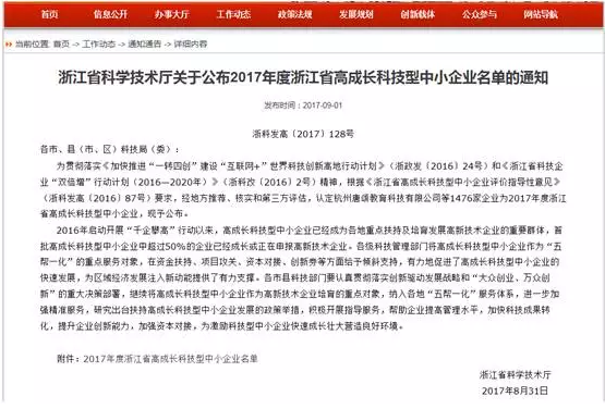 為貫徹落實《加快推進“一轉四創”建設“互聯網+”世界科技創新高地行動計劃》(浙政發〔2016〕24號)和《浙江省科技企業“雙倍增”行動計劃(2016—2020年)》(浙科改〔2016〕2號)精神,根據《浙江省高成長科技型中小企業評價指導性意見》(浙科發高〔2016〕87號)要求,經地方推薦、核實和第三方評估,認定杭州唐頌教育科技有限公司等1476家企業為2017年度浙江省高成長科技型中小企業,現予公布。