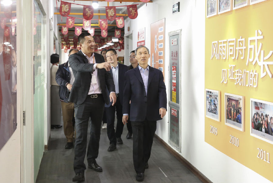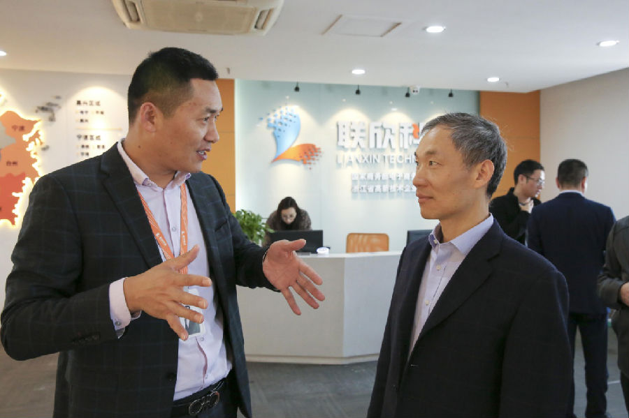 2019年3月30日上午,溫州市副市長殷志軍、副秘書長陳棟、鹿城區(qū)政府、市商務(wù)局、市金融辦及南郊街道馬主任一行前來聯(lián)欣科技參觀指導(dǎo)工作。聯(lián)欣集團(tuán)董事長趙新立、總裁吳勇波、副總裁王文輝、常務(wù)副總胡凱陪同參觀了聯(lián)欣科技總部并就聯(lián)欣科技目前的工作情況作出匯報。
