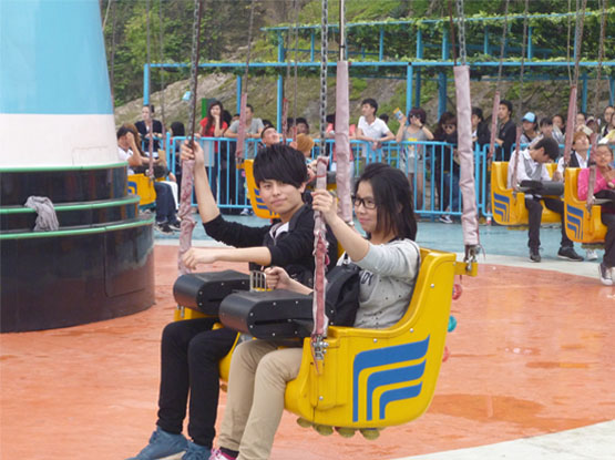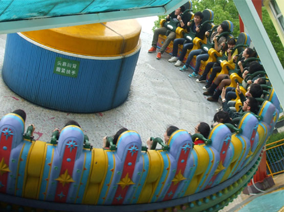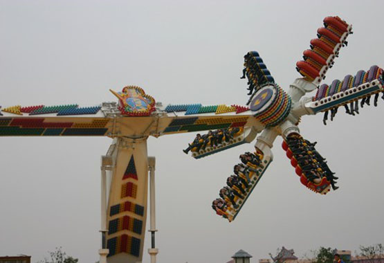 看--UFO.UFO在左右蕩漾中快速自轉既體驗蕩秋千從最高點落下來時的失重狀態.又體驗它從最高點到最低點之間的快速轉換.整個過程之中只聽見大家不斷尖叫.尤其是當兩個最高點和兩個最低點交互重疊時的驚險刺激體驗!兩個最高點重合時那種強大的離心力.兩個最低重合時那種突然無處依靠的失重狀態.仿佛心一下子懸空了.沒有著落.只有尖叫.狂暈了!
