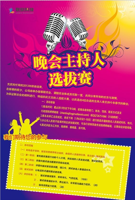 充實而忙碌的2013年即將結束,在新春的前夕,公司將舉辦新春聯歡會,望聯欣全體成員歡聚一堂,共同分享所有的歡樂與激情。為保證聯歡會的順利進行,特組織此次主持人選撥大賽,以此選出4位合適的主持人來主持今年春節的晚會。