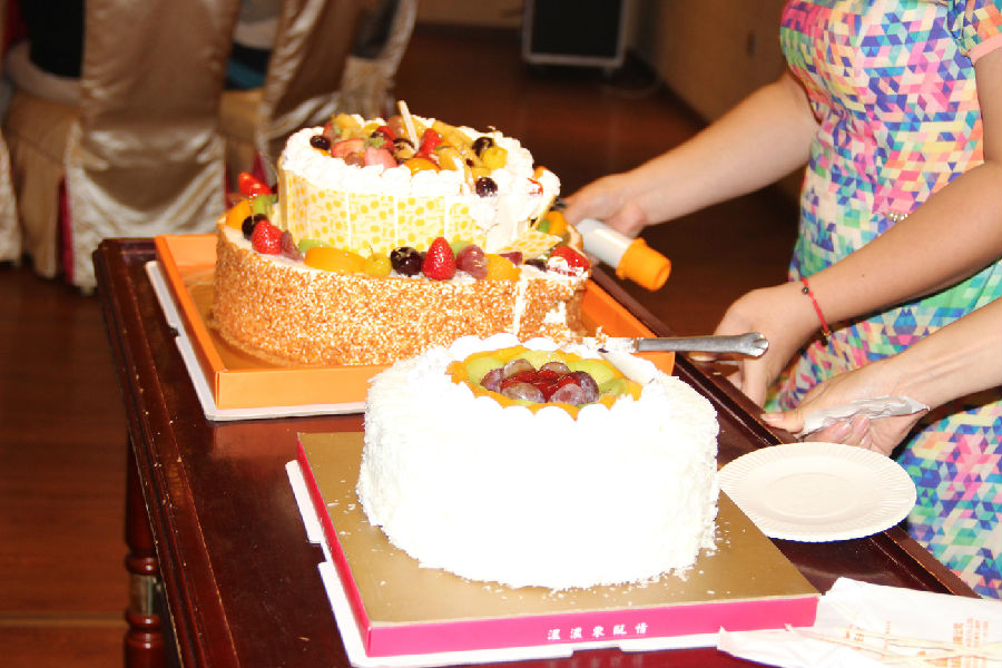 生日會肯定少不了生日蛋糕了,蛋糕是甜蜜與幸福的象征。公司給我們的壽星們準備了雙層水果大蛋糕,看到蛋糕推上來,那種甜蜜的幸福感覺更加的強烈了。